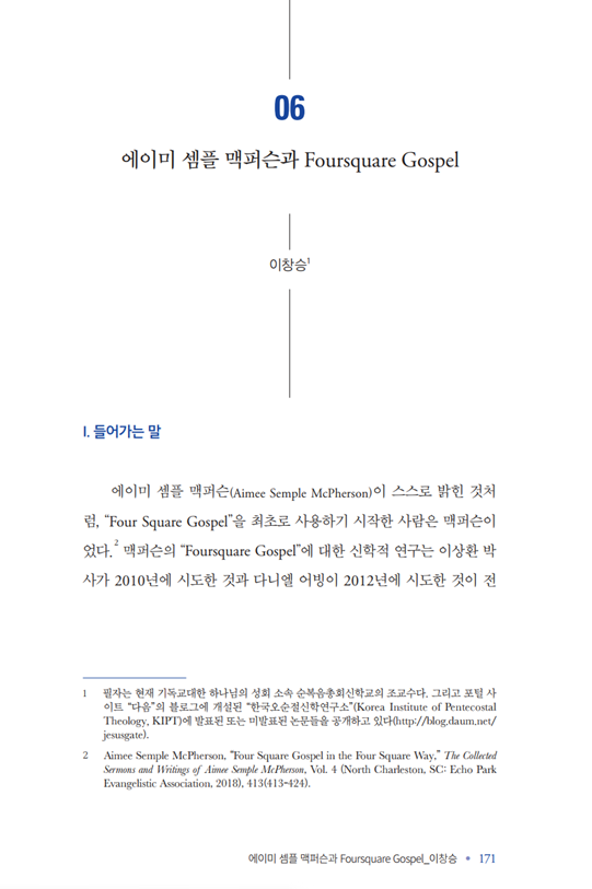 이상환. “맥퍼슨의 오순절사역의 특징.” 『오순절신학논단』 (8) (2010.12): 173-214.
