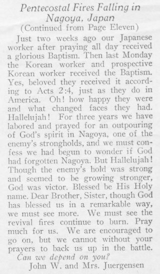 Juergenson, John W. and Mrs. “Pentecostal Fires Falling In Nagoya, Japan.” Pentecostal Evangel Nov. 951 (June 4, 1932), 7, 11.