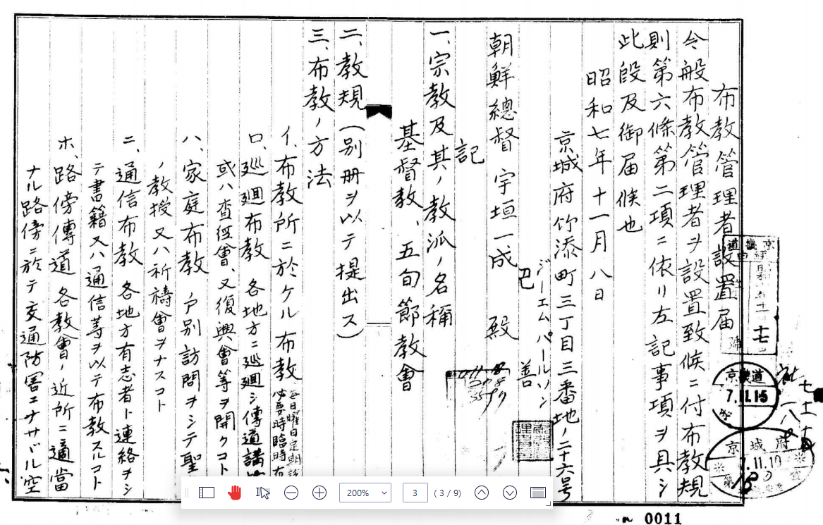 1933년 11월 8일 조선총독부에 “포교관리자 설치 신청서” 제출