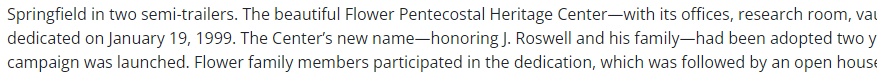 로스웰 플라우어(1888-1970)는 19세가 되던 해에 글렌 쿡(Glenn A. Cook)이 1906년 12월에 인디아나폴리스(Indianapolis)에서 열었던 오순절 집회에 가족들과 함께 참석하여 성령침례에는 방언이라는 성경적 증거가 동반된다는 교리(the dogma)를 받아들였다. 글렌 쿡은 시무어의 아주사 집회에서 방언을 동반하는 성령침례를 받았었다. 그리고 플라우어는 21세에 그 교리를 경험했다.