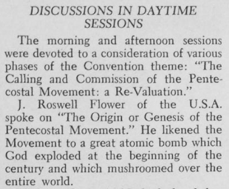 1955년 6월에 스웨덴, 스톡홀름에서 오순절 세계 연맹(Pentecostal World Fellowship)이 주최하는 제4회 세계 오순절 교회 컨퍼런스(World Conference of Pentecostal Churches)가 열렸다. 그 집회에서 로스웰 플라우어는 “오순절운동의 기원”이라는 글을 발표했다. 그는 오순절운동을 핵폭탄에 비유했다. 그는 하나님께서 20세기가 시작되는 때에 그 핵폭탄을 터트리셨고, 그 버섯구름이 전 세계를 뒤덮었다고 주장했다. 그의 글은 7개월 뒤인 1956년 1월 29일에 Pentecostal Evangel에 실렸다. 그 후 그 글은 1999년 4월 Enrichment Journal에 다시 실렸다. 플라우어가 1950년대에 오순절운동의 파함 기원을 강력하게 주장하고 있을 때, 한국에 미국 하나님의 성회의 공식 선교사들이 들어와 활동하기 시작했다. 이 사실은 기독교대한 하나님의성회의 오순절신학, 특히 오순절 기원 이해에 끼쳤을 그의 영향력을 추정해 볼 수 있게 한다.