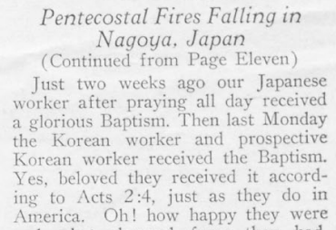 우리는 지난 월요일에 수업을 정오에 끝내기로 결정하고 끝마치는 기도를 위해 일어섰습니다. 그때 주님의 영이 마치 영광의 파도처럼 그 학급 전체를 덮었습니다. 그리고 많은 사람들이 성령을 받았습니다. 그들 중에는 두 사람의 한국인들, 배 형제[배부근]와 공산주의자가 되었다가 감옥에 갇히기도 했고, 그곳에서 회심했던 박 형제[박성산]가 있었습니다. 그들은 도쿄에 있는 성경 학교(the Bible School in Tokyo)를 다니고 있었습니다. 그들의 후원은 그쳤고, 그래서 그들은 6개월 이상 후원을 받을 필요가 있습니다. 여러분이 후원하겠다면, 후원금을 보낼 방도를 찾아보십시오.
