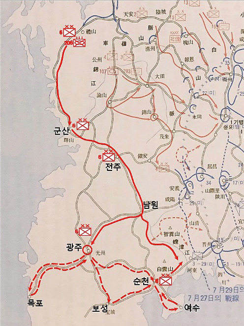 그런데 사실 방호산이 이끌던 6사단은 빠르게 하동까지 진격했지만, 그 과정에서 목포, 순천, 그리고 여수를 점령했는데, 그것은 결정적 실수로 평가된다. 그 지역들을 점령하지 않았다면, 더 빨리 경남으로 진격했을 것이고, 국군과 유엔군은 수습할 수 없는 피해를 입었을 것이라는 것이다. 6사단은 충청지역으로 진출한 뒤 전남 남원, 경남 진주로 직행하지 않고 오른쪽으로 돌아 목포와 순천, 여수를 점령하는데 3일가량을 흘려보냈다. 또 충남 공주까지 진출했다가 세종시 전의면 지역으로 부대를 후퇴시켜 4일을 보냈다. 대전에 집결한 미군의 병력 규모를 과대평가해 일단 부대를 뒤로 물렸다. 이 1주일은 이후 전세를 결정지을 정도의 영향을 미쳤다. 국군 해병대의 분전과 미군의 반격에 북한군은 진주에서 더 이상 전진하지 못했다. 그리고 그해 9월 역사적인 인천상륙작전으로 전세가 완전히 뒤집히게 된다. 그래서 그런 북한군의 오판은 6·25 전쟁 최대 미스터리로 남았다. 워커(Walton Walker) 미 8군 사령관조차 “북한군이 목포와 여수에서 시간을 허비하지 않았다면 전쟁 결과가 어떻게 됐을지 모른다”고 평가했을 정도다.