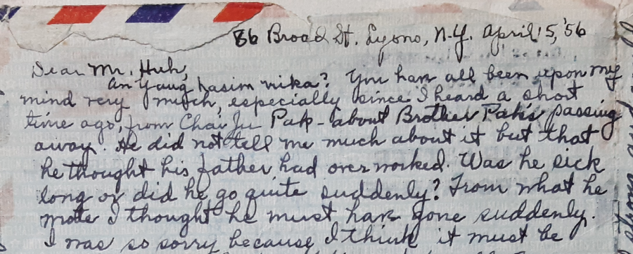 An yong hasim nika? You have all been upon my mind very much, especially since I heard a short time ago, from Chai Ju Park about brother Park’s passing away. He did not tell me much about it but that he thought his father had over worked. Was he sick long or did he go quite suddenly? From what he wrote I thought he must have gone suddenly. I was so sorry because I think it must be very hard for brother Stetz and for all of you without Bro. Park to help in the work. Then it must be very hard for his large family without him, too. It was a great shock to me and I wish it were so I could help you all lots more than I can.