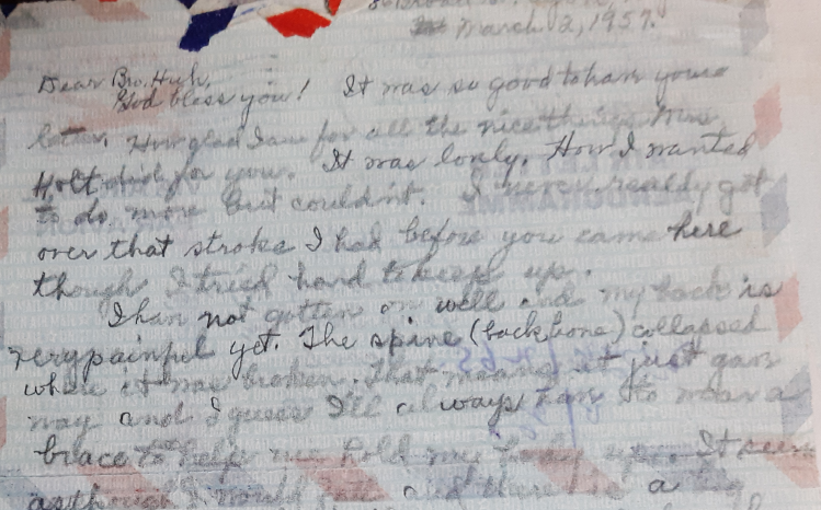 God bless you! It was so good to have your letter. How glad I am for all the nice things Mrs. Holt did for you. It was lovely. How I wanted to do more but could’nt. I were really got over that stroke I had before you came here though I tried hard to keep up.