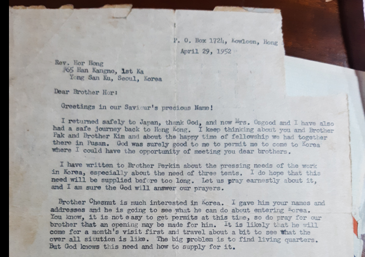 오스굳은 홍콩으로 돌아가기 전에 일본에 들렀다가 체스넛의 일본 활동을 보고 미국 교단 본부에 체스넛의 한국 파견을 추천했다. 홍콩으로 돌아간 오스굳은 1952년 4월 29일에 허홍에게 쓴 편지에서 일본에 선교하고 있던 체스넛이 한국선교에 관심을 보이고 있다고 알렸다. 그 편지에 의하면, 체스넛은 오스굳에게서 한국 오순절 교역자들의 명단과 주소를 받았다.