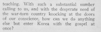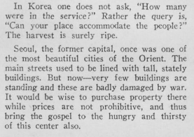 한국은 우리에게 진정한 변화를 보여주고 있다. . . . 우리에게는 정말로 교회 건물이 필요하다. . . . 한국에서는 “몇 명이 예배드렸습니까?”라고 묻지 않는다. 그보다는 “예배당이 성도들을 다 수용할 수 있나요?”라고 묻는다. 진정 추수할 때가 되었다. 수도였던 서울은 동양에서 가장 아름다운 도시들 중 하나였다. 중심가들에는 높고 당당한 건물들이 줄지어 서 있었다. 그러나 지금은 극소수의 건물들만 서 있고, 그마저도 전쟁으로 심각하게 파손되어있다. 값이 비싸지 않을 때 그곳에 건물을 구입하여 이 수도의 주리고 목마른 사람들에게 복음을 전해주는 데 사용하는 것이 현명할 것이다.