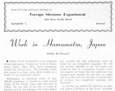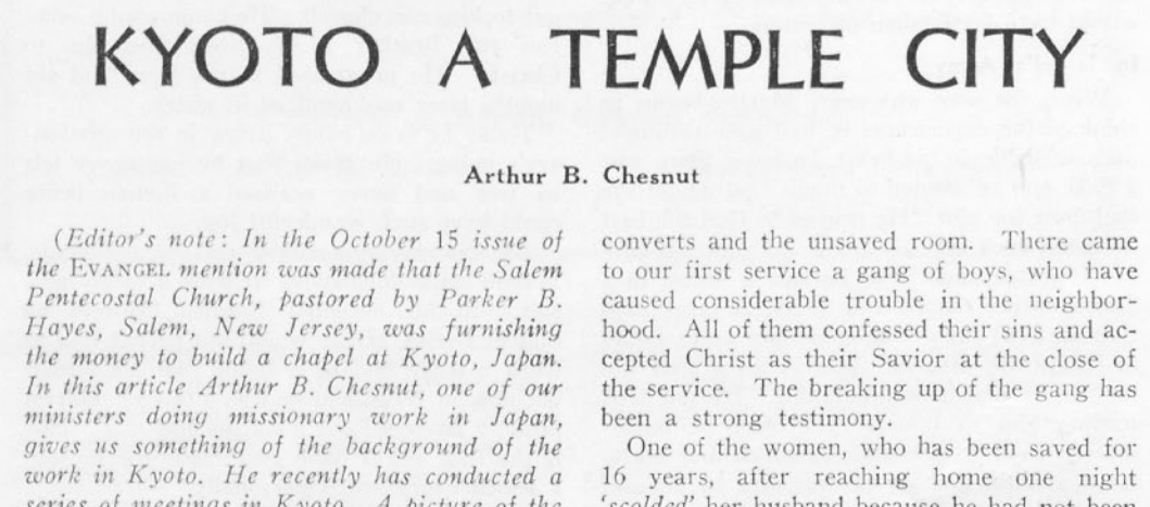 체스넛은 미국 하나님의성회의 공식소식지 Pentecostal Evangel에 일본 선교보고를 3회 기고했다. 그것은 하마마츠(浜松) 리포트(1950년 1월 21일), 쿄토(京都) 리포트(1950년 10월 22일), 그리고 도쿄(東京) 리포트(1952년 7월 6일)였다. 도쿄 리포트에는 1952년 부활절 고마고메(駒込)에서의 주일학교 성회 보고가 있으며, 이 성회에는 750명의 학생과 100명의 교사가 모였다. 땅에 볏짚돗자리를 깔고 하는 성회였다.
