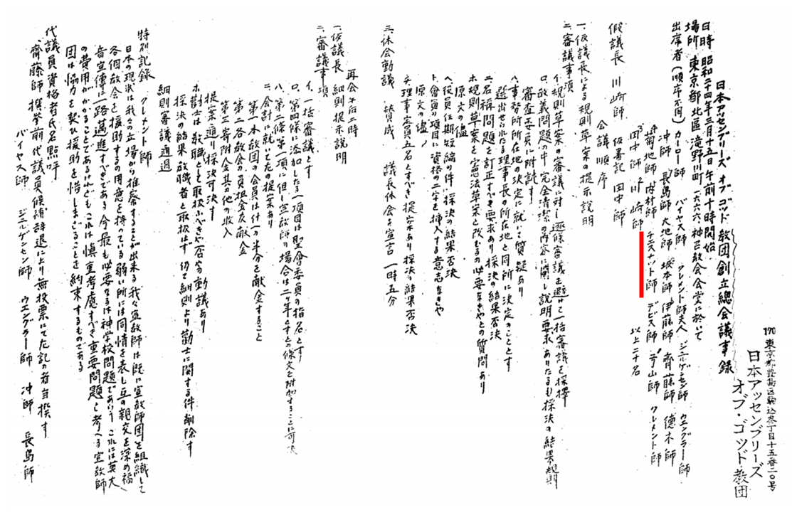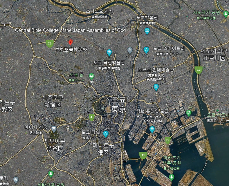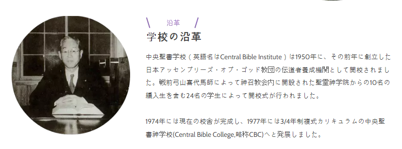 3월에 니혼 어셈블리즈 오브 가드 교단이 설립되어 미국 하나님의성회의 존 클레멘트(John Clement)나 제시 엥글러에 의해 고마고메(駒込) 교단 본부 및 성서학교를 위한 토지가 마련되었다. 당시 도쿄는 건설 자재가 부족해 성경학교를 지을 자재를 쉽게 구할 수 없었다. 체스넛이 근무하던 일본여자경제전문학교가 옛 일본군 기지의 폐자재를 구입했고, 그것을 이용해 교사를 건설했지만, 미사용 자재가 있어 체스넛이 교섭해 그것을 무료로 양도받기도 했다. 그리고 일본여자경제전문학교의 교사의 건설을 도급받은 야자키 공무점(矢崎 工務店)이 성서학교의 교사의 건설도 도급했다. 이 일을 통해서 공무점의 야자키 유노스케(矢崎酉之介) 점장이 그리스도인이 되어 성령 체험(聖霊 体験)을 하게 되었다. 1950년 4월 중앙성서학교(中央聖書學校, Central Bible Institute, 현재 中央聖書神學校, Central Bible College)가 개교되자 체스넛은 성경학교 서기와 회계직과 더불어 중앙성서학교 교원으로서 “오순절의 진리”(ペンテコステの真理)를 매주 3일간 하루에 2~3시간의 강의했다.