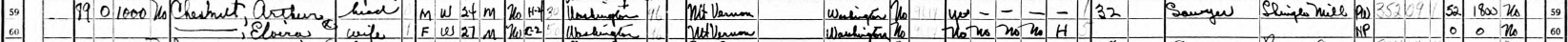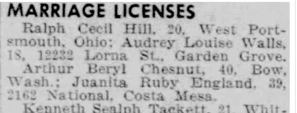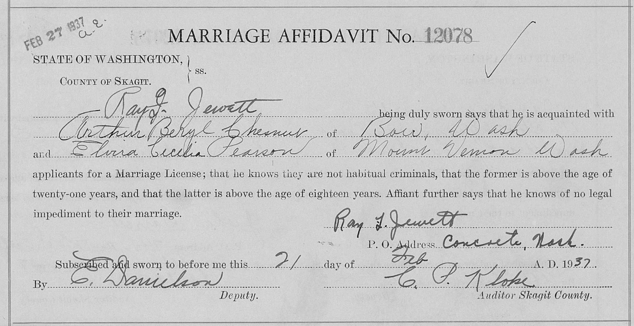 스캐짓 군의 군청이 있는 마운트 버넌(Mount Vernon)에서 살고 있던 체스넛은 1937년 2월 21일에 21세의 나이로 제일복음루터교회(First Evangelical Luteran Church)에서 역시 마운트 버넌에서 살고 있던 엘비라(Elvira Cecelia Pearson)와 결혼했다. 엘비라는 1912년에 7월 28일에 워싱턴 주, 스캐짓 군, 마운트 버넌(Mount Vernon, Skagit, Washington)에서 태어났다.