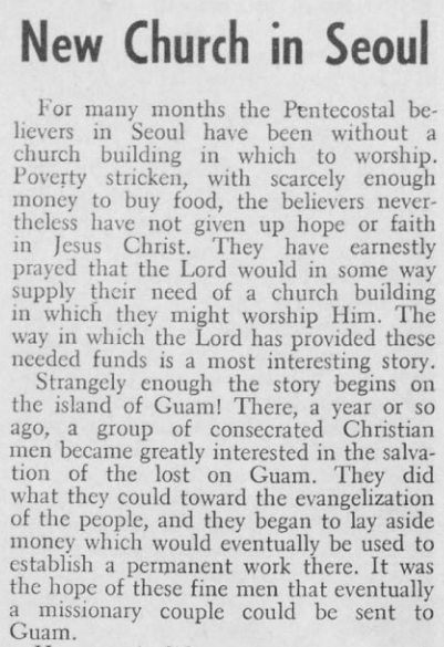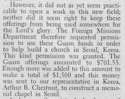 그런데 놀랍게도 이 부지구입과 건축을 위한 비용의 종자돈은 괌섬(Guam)에서 마련된 것이었다. 괌섬에 주둔하고 있던 미군과 군속들과 현지인들로 추정되는 오순절 신자들이 괌의 복음화를 위한 센터가 될 교회건물을 짓기를 원했다. 그리고 선교사를 초청하고 싶었다. 그래서 그들은 그 건물을 위해 기금을 모으기 시작했다. 그런데 미 하나님의성회 선교국은 괌에 그런 계획을 실행하는 것이 시기상조라고 판단했다. 미 하나님의성회 선교국은 괌의 성도들에게 괌대신 한국의 서울에 한국 오순절 교단을 위한 센터로서 교회를 짓는데 그 기금을 사용하면 좋겠다는 제안을 했다. 괌의 성도들은 그 제안을 흔쾌히 받아들였고, 그들이 모은 701.55달러에 다른 기금이 더해져 총 1,500달러가 체스넛에게 송금되었다.