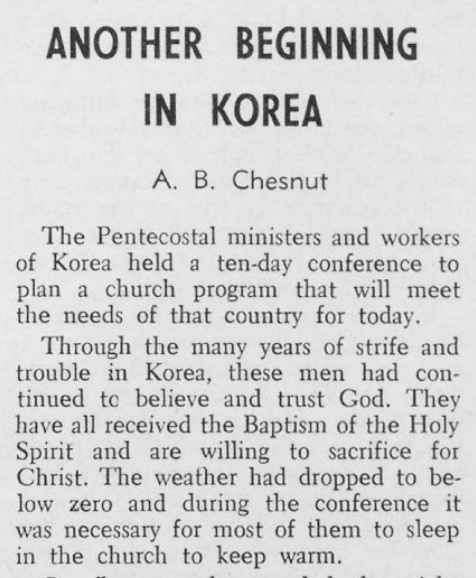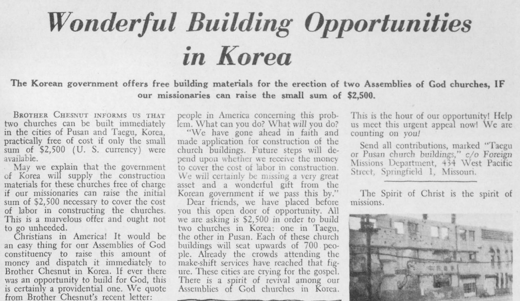 체스넛은 1953년 1월에 오순절 복음지에 한국을 소개하고 한국에 대한 원조, 특히 교회 건물 마련을 위한 원조를 촉구하는 글을 게재했다.