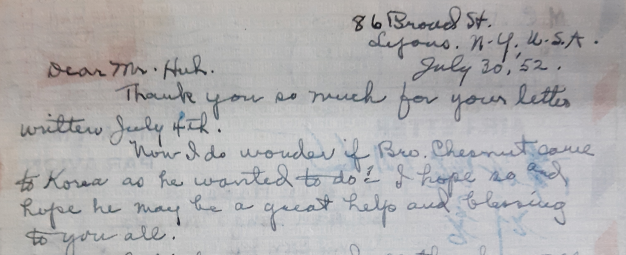 체스넛의 한국행은 미국에서 허홍에게 보낸 메리 C. 럼시의 편지에서도 포착된다. 럼시는 1952년 6월 18일에 허홍에게 보낸 편지에서 일본에 있던 “그 형제”가 한국의 선교사로 갔으면 좋겠다는 자신의 바람을 표현했다. 그리고 럼시는 최초로 남성 선교사가 한국에 가게 되는 것을 긍정적으로 보며 기대했다. 또한 럼시는 7월 30일에 허홍에게 보낸 편지에서 체스넛의 이름을 거론하고, 한국행을 자원한 체스넛이 한국에 도착했는지의 여부를 물었다.