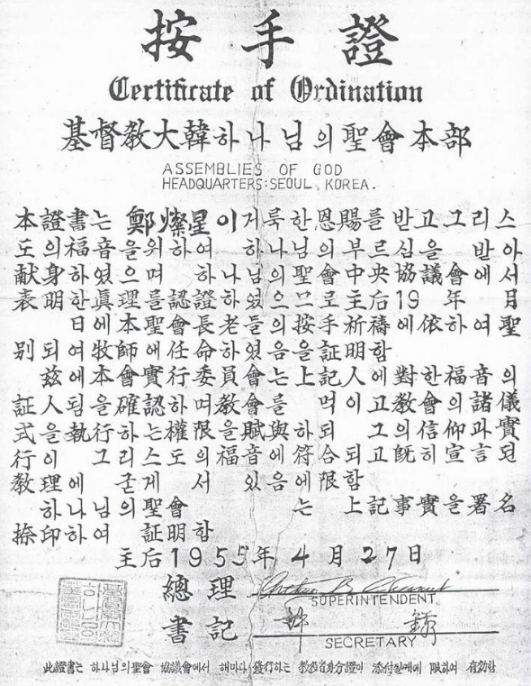 체스넛은 1955년 4월 제4차 총회에서도 총리에 재선되었다. 총리(Superintendent) 체스넛은 정찬성, 김상호, 최요열 등에게 4월 27일자로 기독교대한 하나님의성회 제1차 목사안수증을 발행했다.