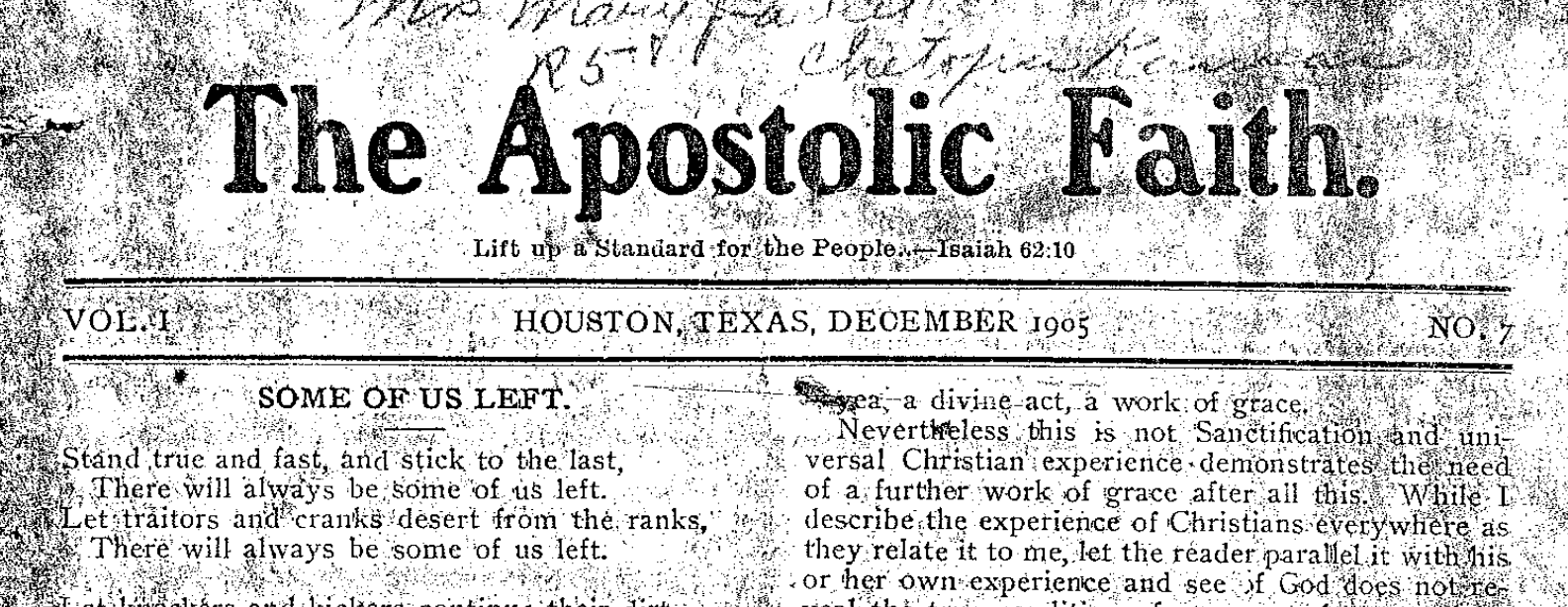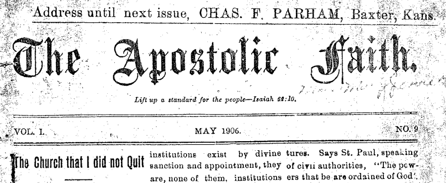 찰스 파함은 신년을 낙관하며 1906년을 맞이했다. 텍사스에서의 사역은 계속 성장했고, 그 성경학교에서 훈련을 받은 사역자들의 증가와 함께 새로운 주들로의 확장이 당연해 보였다. 오순절 운동 안에서 그의 위치에 걸맞게, 파함은 1905년 12월에 “사도적 신앙 운동의 발기인”(Projector of the Apostolic Faith Movement)이라는 명칭을 사용하기 시작했다. 비록 그가 그 갱신적 노력은 모든 교회와 신자를 위한 것이라는 것을 지적했지만, 그는 인간 권위의 목소리가 어디에 있는지에 대한 의심의 여지를 남기지 않았다.