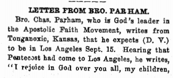 찰스 파함 형제는 사도신앙운동에 있어서 하나님의 지도자인데 캔사스 주, 통가녹시(Tonganoxie, Kansas)에서 쓴 편지를 통해 그가 9월 5일 로스앤젤레스에 있기를 기대한다는 것을 알렸다. 오순절이 로스앤젤레스에 임했다는 것을 들은 그는 다음과 같이 썼다. “저는 비록 여러분을 본 적이 없지만, 그러나 여러분이 성령의 능력을 알기 때문에 저의 자녀들인 여러분 모두 때문에 하나님 안에서 기뻐합니다. 우리는 한 성령에 의해 침례를 받고 한 몸이 되었습니다. 제가 갈 때까지 합하여 일치를 유지하십시오. 그러면 하나의 큰 집회가 여러분 모두를 제가 바라는 선교지들을 위해 준비되게 할 것입니다. 하나님께서 반대로 이끄시지 않는 한, 저는 제가 갔을 때 여러분 모두를 만나고, 그리고 여러분 모두가 순복음을 가지고 있는 것을 보기를 원합니다.