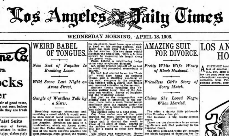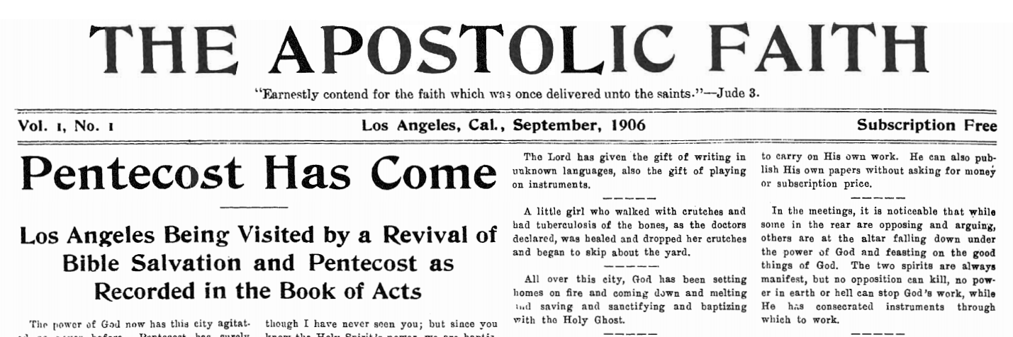 “기이한 방언의 바벨”(Weird Babel of Tongues)이라는 헤드라인으로 독자들을 어리둥절하게 만든 로스앤젤레스 데일리 타임즈(Los Angeles Daily Times)한 기사에 의해 박차가 가해진 아주사 선교회(the Azusa mission)는 서서히 호기심과 영적 기대가 가득 찬 보다 많은 사람들을 끌어들였다.