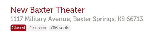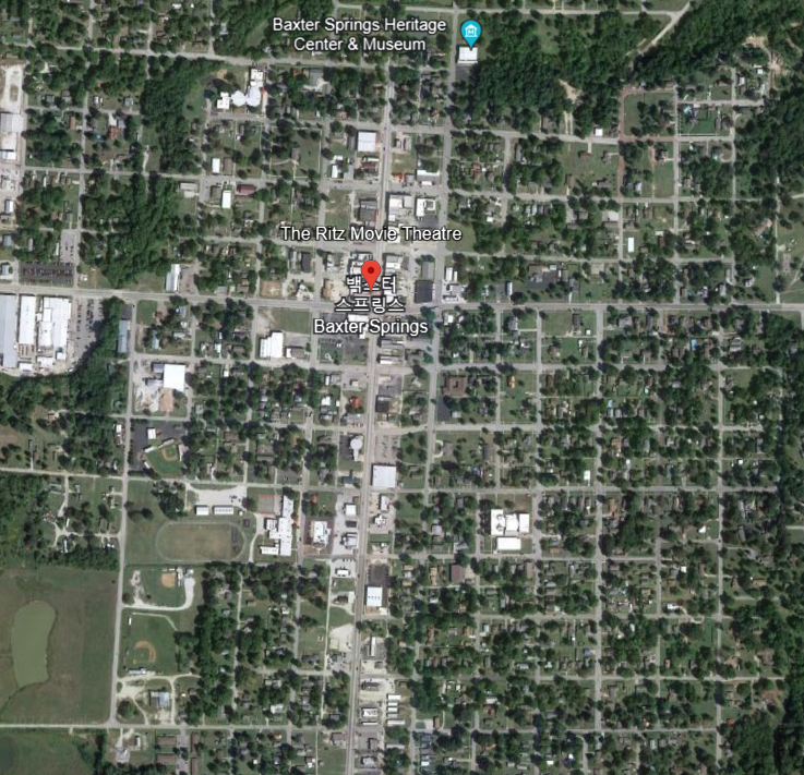 1929년 당시 백스터 스프링스에는 두 개의 극장이 있었다. Ritz Theater와 the New Baxter Theater였다. Ritz Theater 건물은 1880년대에 창고로 쓰이다가 1925년까지 사회적 회합 장소로 사용되었었고, 1926년부터 1950년까지는 Ritz라는 이름이 붙은 극장으로 사용되었다. 총 좌석은 488개였다. (https://cinematreasures.org/photos?page=2&theater_id=30040)