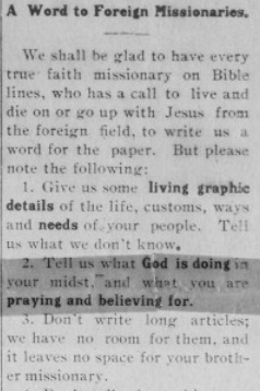 우리는 지쳤고 그리고 전 세계를 여행하면서 경치만 구경하고 돌아오는 실험적 선교사들을 부끄러워하고 있다. . . . 우리는 언어를 배우는, 구원받은 사람들의 성회들을 세우는, 그들을 가르치고 그리고 그들이 자신의 사람들을 전도하게 하기 위해 그 사람들과 함께 머무는 사람들을 원한다.