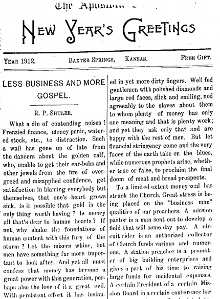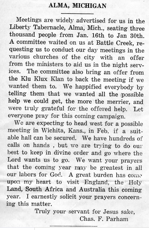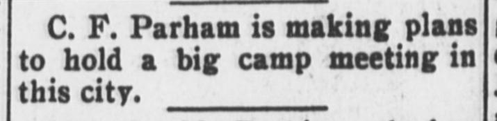 백스터 시민회관(the city hall)을 빌린 미스터 파함은 지역 교회들에 의해 거부당했지만, 삼일 동안 저녁 집회를 열었고, 그 집회들을 강제로 끝내게 하려는 세력들에 의해 전선들이 끊겨졌다. 그러자 그는 한 당구장을 빌렸다. 그 모든 것을 통해 미스터 파함은 지금까지 여기서 성취된 것 중에서 가장 위대한 종교적 성공을 거두었다.