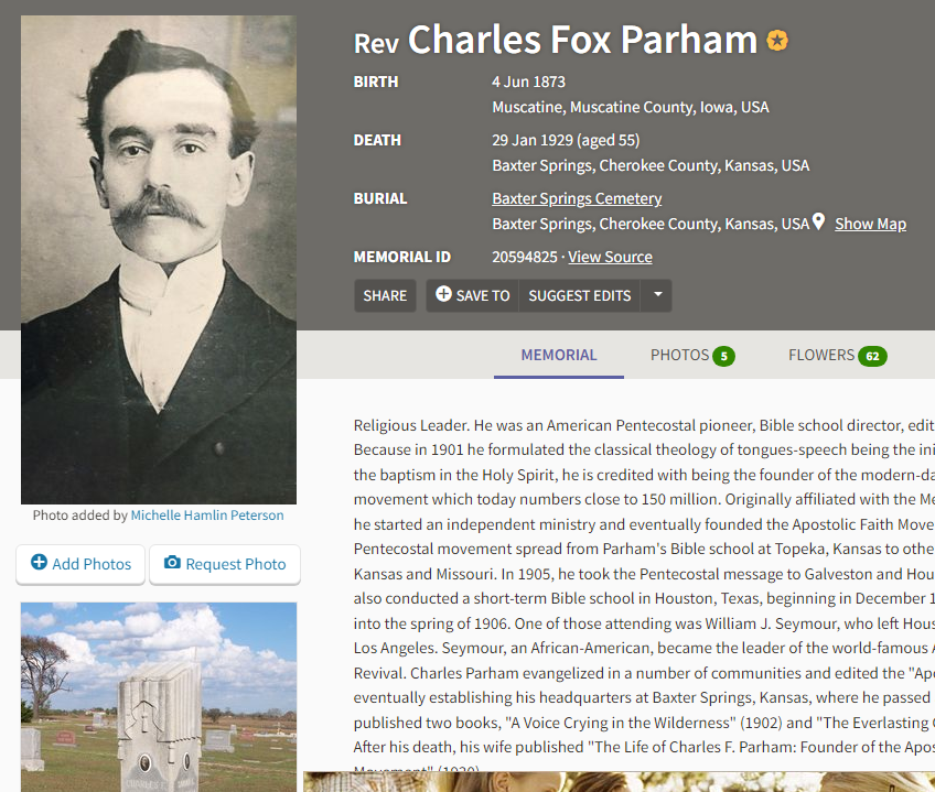 그 장례식 직후, 사도 신앙 추종자들은 그의 묘석 위에 설교단 모양의 인상적인 기념비를 세웠다. 그 헌사는 그 비문을 통해 세계에 파함이 “사도신앙운동의 설립자”였다는 것을 세계에 상기시켰다. 그러나 그 기념비는 1929년 대다수의 오순절주의자들에게 별 의미가 없었다.