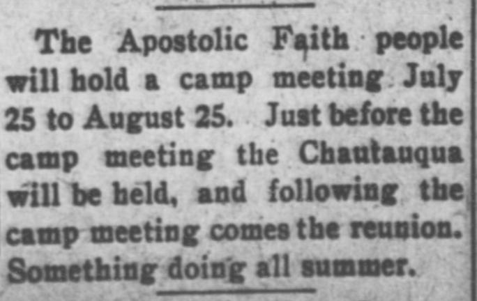 1910년에, 부분적으로 오순절주의 안에서 증가하고 있던 신학적 다양성에 대한 염려 때문에, 파함은 백스터 스프링스에 전국 캠프 집회(National Camp Meeting)를 결성했다. 그것은 본질적으로 그 자신의 추종자들을 위한 집회였고, 그는 그것을 “광신적인 정령주의적 가짜 운동들”을 교정하려는 것이라고 말했다.