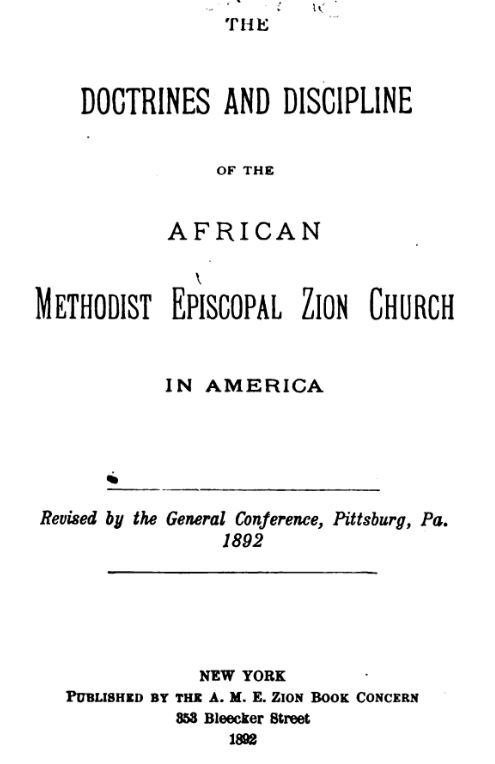 그 외에 또 다른 교단의 『교리와 계율』이 시무어의 단행본과 관련된다. 그 교단은 아프르칸 감독 감리교회(African Methodist Episcopal Church)다. 1793년에 필라델피아 감리회 소속의 일단의 흑인들이 흑인들만의 교회를 세우고 벧엘(Bethel)이라고 명명했다. 그런 교회들이 증가했고, 그 교회들은 1816년에 아프리칸 감독 감리교회(African Methodist Episcopal Church) 총회를 결성했다. 인터넷 상에서 볼 수 있는 아프리칸 감독 감리교회의 『교리와 계율』은 1817년 판이다.