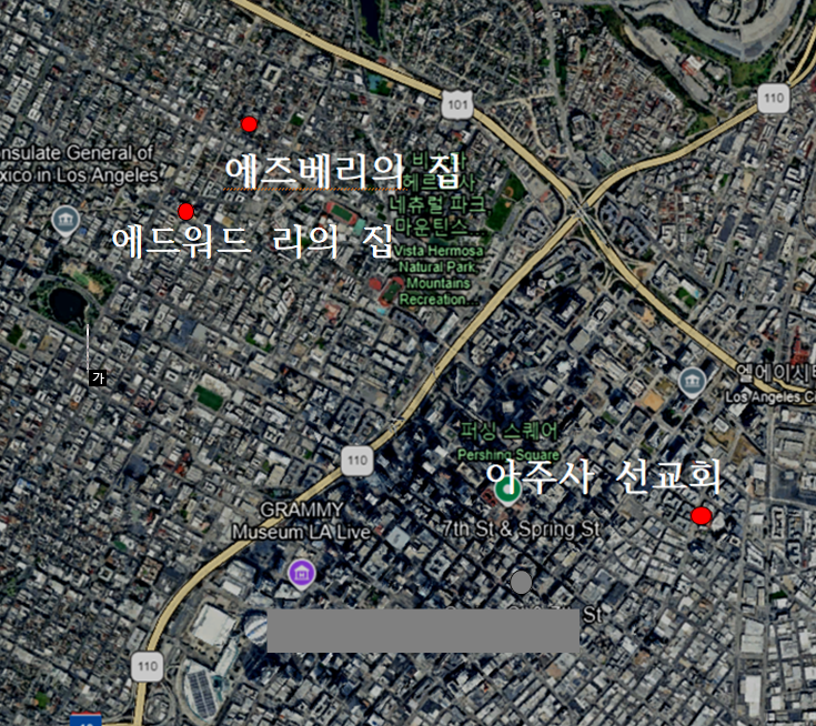 시무어와 그와 함께 했던 소수의 사람들은 로스앤젤레스의 노스 보니 브래 스트리트 216 번지 있는 리차드와 루스 에즈베리(Richard and Ruth Asberry)의 집에서 그 새로운 사역을 계속하도록 초청을 받았다. 많은 사람들이 성령침례에 대한 시무어의 가르침을 받아들였지만, 아무도 시무어가 묘사한 그 경험을 하지 못했다. 시무어는 그의 회중에게 그의 친구, 루시 패로우에 대해 말했고, 그들은 패로우가 로스앤젤레스로 와서 시무어와 함께 사역할 수 있도록 하기 위해 그녀에게 기차표를 사주는데 충분한 돈을 모음으로써 응답했다. 시무어는 루시 패로우와 워렌(J. A. Warren)이 4월 9일에 로스앤젤레스로 오도록 주선했다.