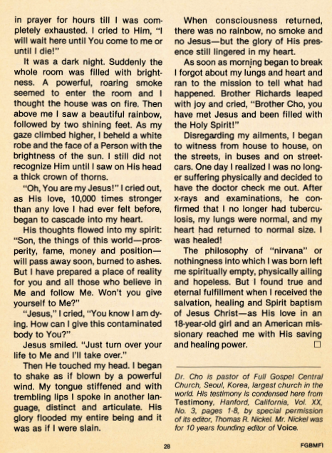 그러나 [한국 전쟁으로 인한] 이 불행 속에서도, 하나님께서는 주린 마음에 성령을 부어주셨다. 수백 명의 고귀한 불신자들이 구원을 받았다. 그 사람들 가운데 부산에서 살고 있던 젊은 의학도 “조용기”가 있었다. 이 청년은 구원을 받고, 성령으로 충만함을 받았고(filled with the Holy Spirit), 폐결핵을 치유 받았고, 그리고 사역의 소명을 받았다.