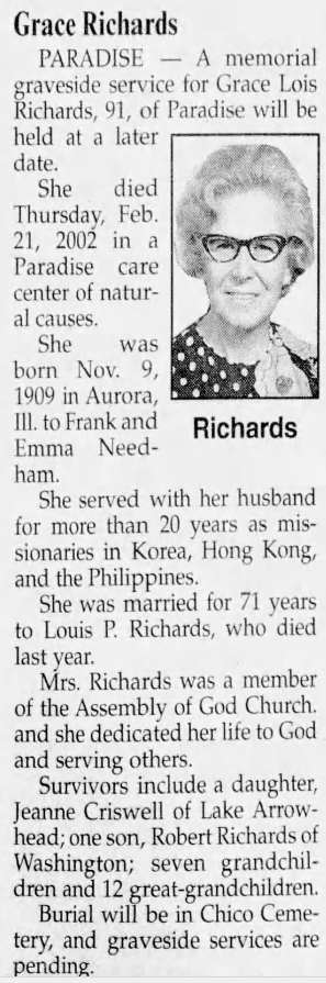 마침내 리차드는 2001년 11월 7일 수요일에 미국, 캘리포니아, 버트, 마갈리아(Magalia, Butte, CA, USA)에서 94세에 소천했다. 그의 남은 몸은 치코 세미트리(Chico Cemetery)의 Sec 14,B Lot 50,B sp 1에 안치되었다. 당시 그의 아내 그레이스 리차드(Grace Lois Needham Richards)는 91세였으며, 슬하에 아들 로버트 리차드(Robert Louis Richards)와 딸 제인 크리스웰(Jaenne Criswell)이 있었으며, 그들에게는 12명의 자녀들이 있었다. 리차드의 소천은 2003년에 발간된 소천 목회자 추념록에서도 발견된다. 그 책에 의하면 그는 캘리포니아 북부 네바다(Northern California Nevada) 지방회 소속이었다. 그로부터 약 3개월 후인 2002년 2월 21일에 그의 아내가 버트 카운티, 패러다이스(Paradise, Butte County) 돌봄센터(Paradise Care Center)에서 92세를 일기로 세상을 떠났고, 그녀의 남은 몸은 그의 남편 곁에 묻혔다.