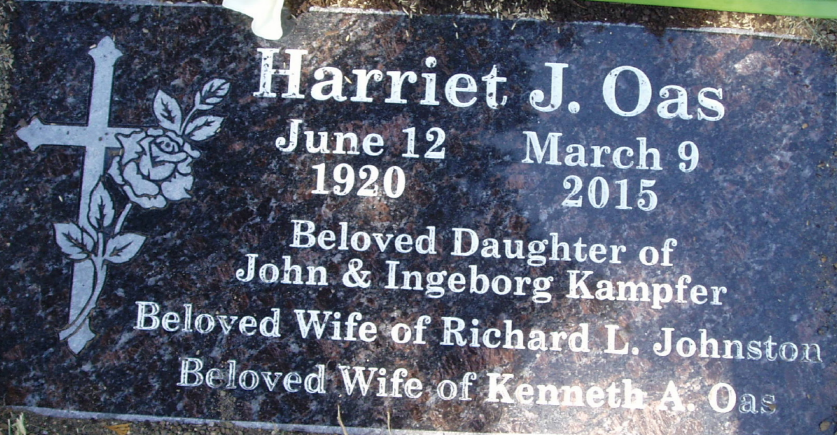 그녀의 남편이 소천한 후, 헤릿(Harriet)과 그녀의 세 자녀, 케이스 레로이(Keith Leroy), 루이스(Louise), 그리고 리차드 로렌스(Richard Lawrence)는 그녀의 고향 알바니에 정착했다. 그녀는 그곳에서 공군 군무원으로 일했다. 그 후 그녀는 워싱턴 주에 있는 포르 르위스에 배속되었다. 헤릿은 타코마(Tacoma) 지역에 정착하면서 타코마 라이프 센터(Tacoma Life Center)에 다니게 되었고, 그곳에서 그 교회의 오랜 성도였고 1966년에 아내를 사별했던 케네스 아더 오아스(Kenneth Arthur Oas)를 만나, 존스턴의 소천 10년 후인 1972년에 재혼했다. 케네스와 헤릿은 오랜 동안 우정을 발전시키면서 그 교회의 사역과 교제들에 깊이 참여해 왔었다. 그들은 워싱턴, 올랄라(Olala)로 은퇴했고, 그곳에서 자연의 아름다움을 만끽하며 정원 가꾸기를 즐겼다. 그들의 집은 따뜻한 환대의 센터가 되었다. 노스뷰 테라스(Northview Terrace)로 이사한 후에도 그녀는 계속 옥상에서 정원 가꾸기를 즐겼다. 재혼한지 10년 후 2003년에 오아스가 소천하고 헤릿은 1938 Fairview Avenue E #300 Seattle, WA에 있는 유니온 호숫가의 메릴 가든스(Merrill Gardens)를 거쳐 2015년 3월 9일에 보다 남쪽에 있는 2901 Bridgeport Way West University Place, WA에 있는 프란시스칸 호스피스 홈(Franciscan Hospice Home[House])에서 편안하게 소천했다. 그녀의 남은 몸은 존스턴의 몸이 묻힌 알바니의 빌라메트 메모리얼 파크(Willamette Memorial Park)에 묻혔다.
