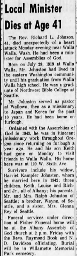 그런데 7월 10일, 월요일 저녁에 41세 리차드 L. 존스턴은 갑자기 심장마비(a heart attack) 후 주님과 함께 있기 위해 소천했다. 50년사는 존스턴이 “다음 사역을 위해 미국에 돌아가려고 귀국을 준비하던 중에 갑자기 소천했다”고 기록했다. 그러나 그는 다음 사역을 위해 미국에 돌아간 것이 아니라 휴가를 위해 돌아갔고, 귀국을 준비하던 중에 소천한 것이 아니라, 귀국 1년 후에 소천했다. 1961년 7월 10일 휴가 중이던 그와 그의 아들 케이스(Keith)는 그 월요일에 왈라왈라에 있는 고향 친구들을 만나러 갔었는데, 심장마비로 갑자기 사망했던 것이다. 아마도 그는 사역지, 한국으로 돌아갈 준비를 하던 상태였을 것이다.