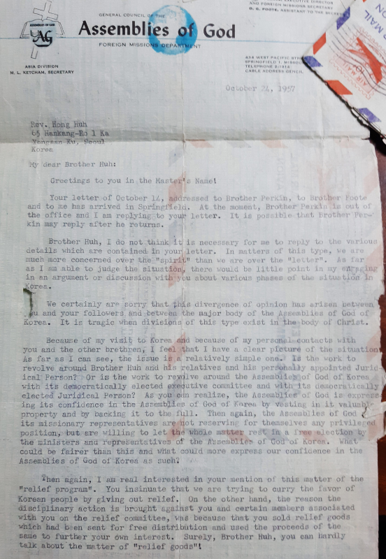 제가 한국을 방문했었고, 당신과 다른 형제들과의 저의 사적인 접촉들 때문에, 저는 그 상황을 분명하게 파악하고 있다고 느낍니다. 제가 이해하는 한, 이 문제는 상대적으로 단순합니다. 그 사역은 허 형제와 친척들 그리고 개인적으로 설립한 재단법인을 중심으로 진행되는가요? 아니면 그 사역은 하나님의 성회의 민주적으로 선출된 실행위원회와 민주적으로 선출된 재단법인 이사회를 중심으로 진행되는가요? 형제도 인식할 수 있듯이, [미국] 하나님의 성회는 그 가치 있는 재산을 재단법인에 귀속시키고 전적으로 지지하는 한국 하나님의 성회에 신뢰를 표하고 있습니다. 다시 말하자면, 하나님의 성회와 선교적 대리인들은 스스로 그 어떤 특권적 위치를 차지하려 하지 않습니다. 다만 그 문제 전체를 기독교대한 하나님의 성회의 목회자들과 대표들에 의한 자유로운 투표로 해결하게 하려 합니다. 무엇이 이것보다 더 공정할 수 있겠습니까? 그리고 무엇이 그렇게 하는 것보다 기독교대한 하나님의 성회에 대한 우리의 신뢰를 더 표현할 수 있겠습니까?